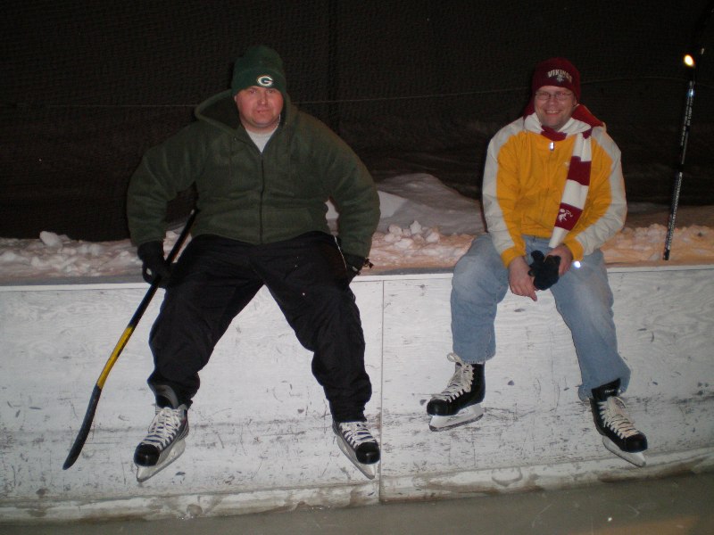 Last week we played a bunch of hockey. I’ve added some pictures of us in the photo album. Erin was our official photographer and 911 dispatch. Below you see Steve and I taking a break. While we were playing the warming house door knob broke, and the worker couldn’t get out. So the younger players fixed the door. We were waiting… okay, catching our breath.