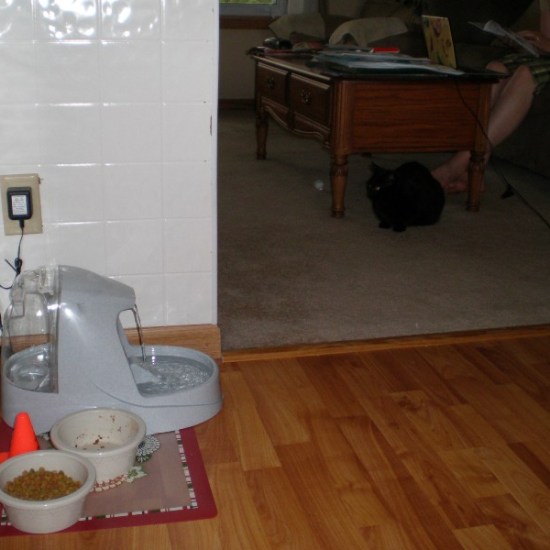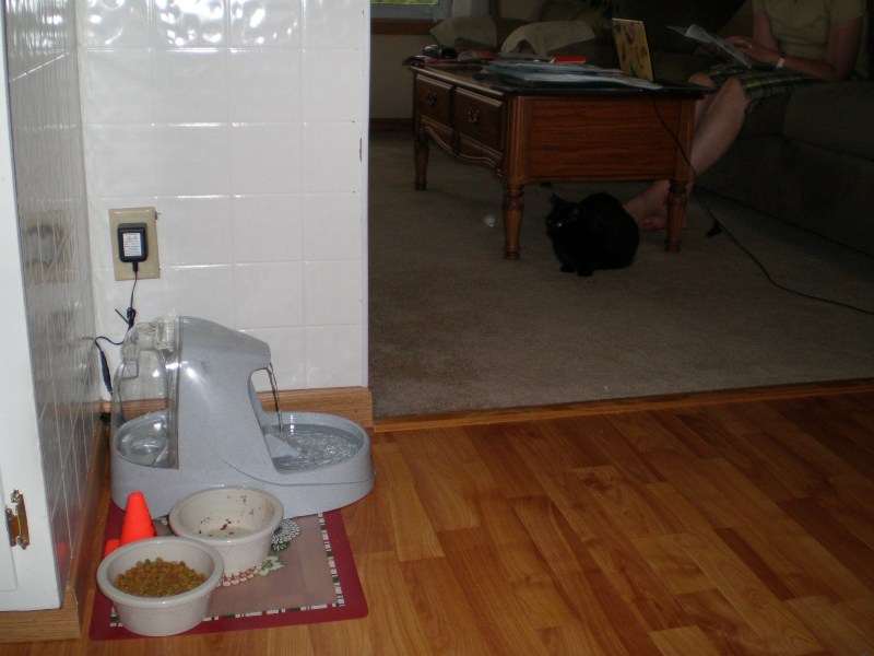 2. I caught Nubs drinking from the new dish this morning, and directly off the fountain. I think she enjoys messing with Erin and I over changing her stuff. =-)