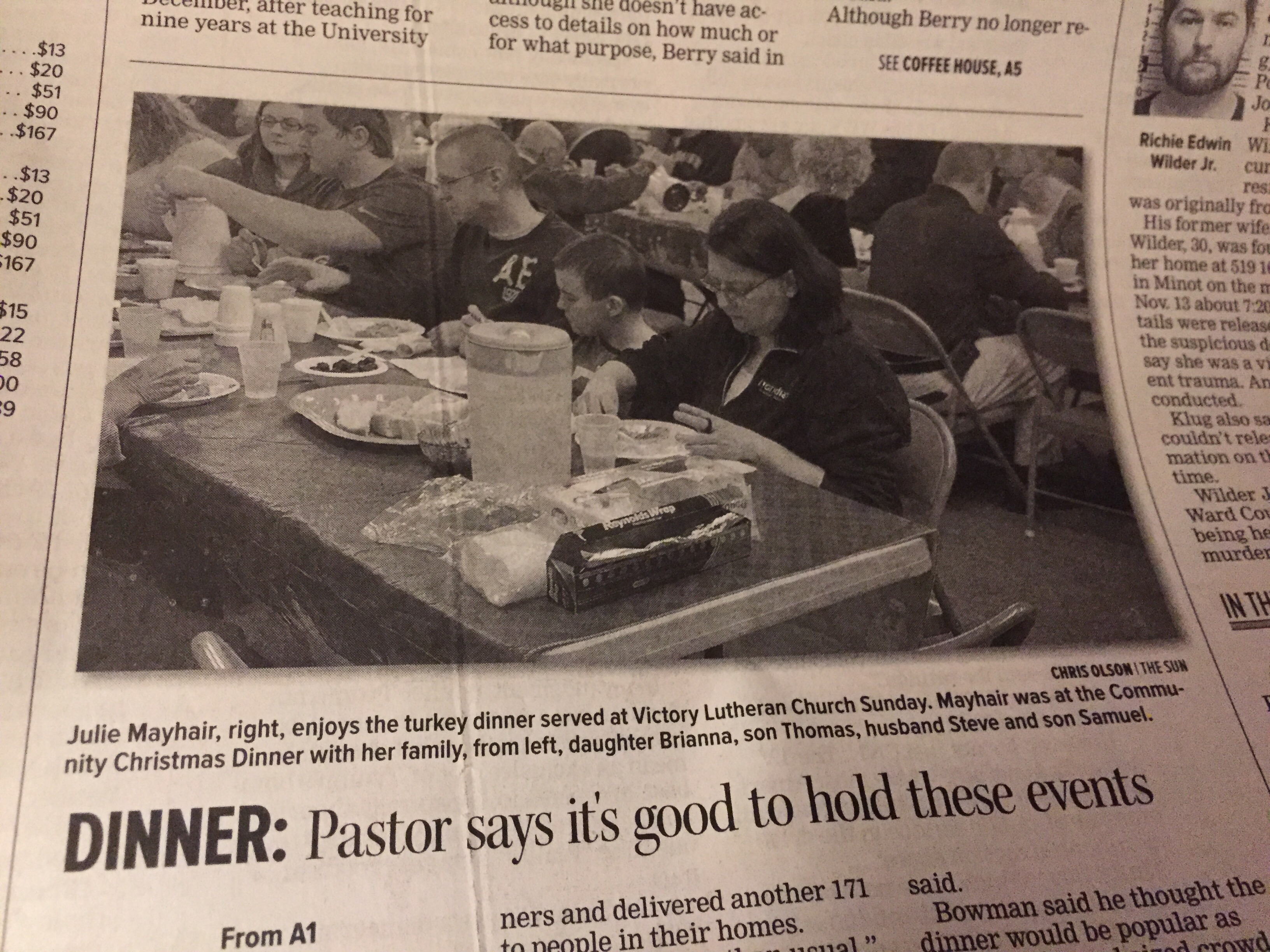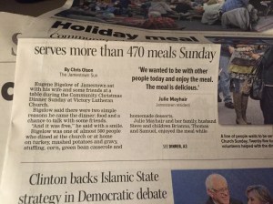 December 21, 2015 Dave Christmas dinner The Mayhair family played a big part in a church Christmas dinner. Here’s the coverage in the paper. Share this: Click to share on X (Opens in new window) X Click to share on Facebook (Opens in new window) Facebook Like Loading...