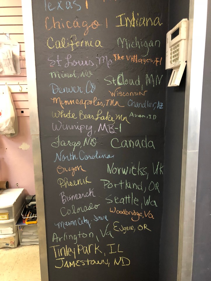 We paid a visit to Widman’s Candy in Grand Forks – home of the chippers – yum. The board shows where visitors are from that day.