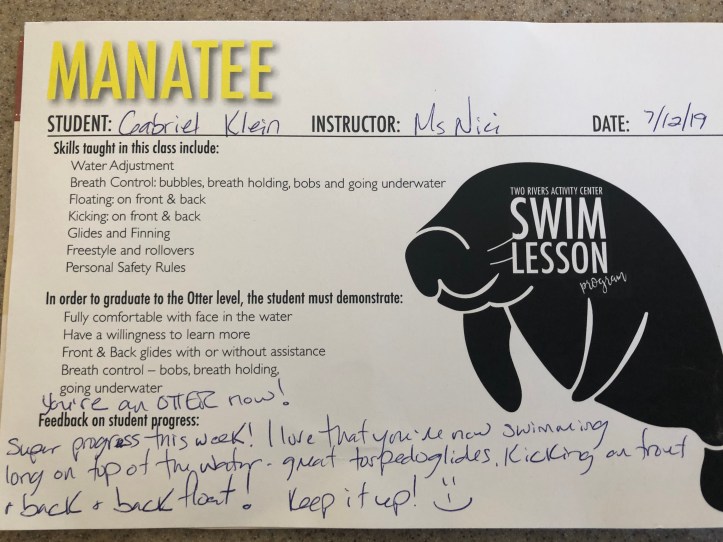 July 13, 2019 Dave Swim lessons Gabe passed his swim test and moved up a rank. He worked hard and won a free pizza! Share this: Click to share on X (Opens in new window) X Click to share on Facebook (Opens in new window) Facebook Like Loading...